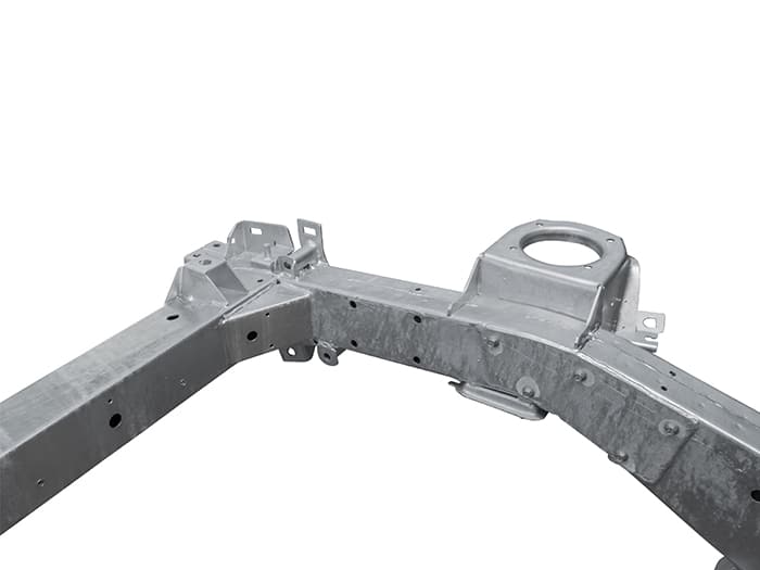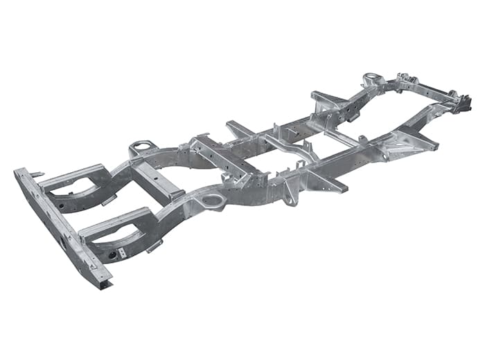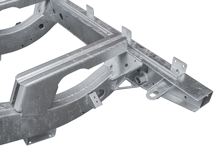 OEM manufactured with hot dipped galvanized finish. Replacement for Defender variants with a rear mounted plastic fuel tank. Chassis features the latest Puma updates with reinforced main rails, upgraded bulkhead outriggers and rear cross member with integral fixing nuts for tow plate and recessed mounting point for towing plug.