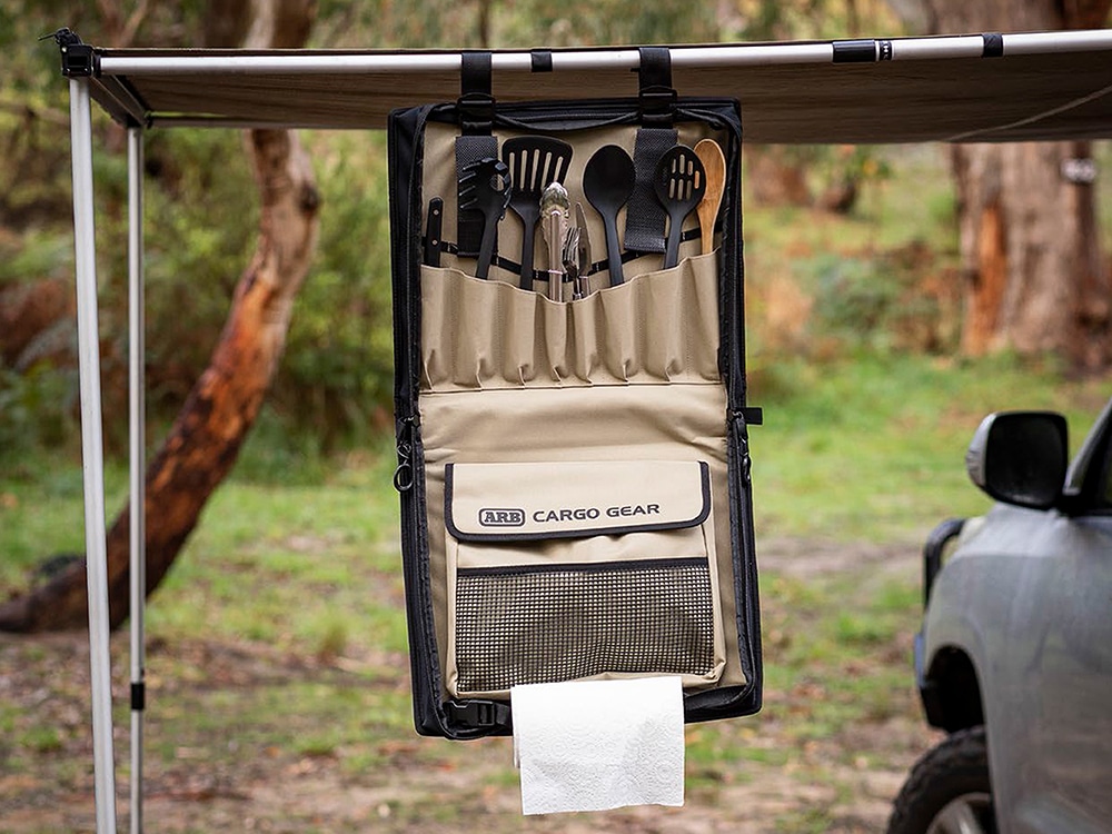 The convenient way to streamline your camp kitchen. With multiple sleeves for your utensils, a built-in internal pocket, an easy clip paper towel holder and outer rubber mesh pocket, the ARB Camp Kitchen Organiser is the perfect accessory to keep all your kitchen essentials in one place. Featuring a durable PVC outer shell with neoprene sides for flexibility, there are multiple mounting options including eyelets, hook loop straps and splines for fitting to a sail track (including the ARB Awning). This organiser is the ultimate tool for your kitchen on the road.