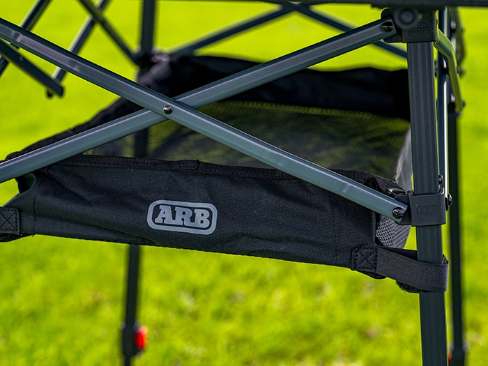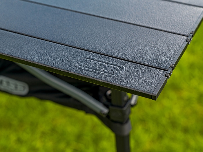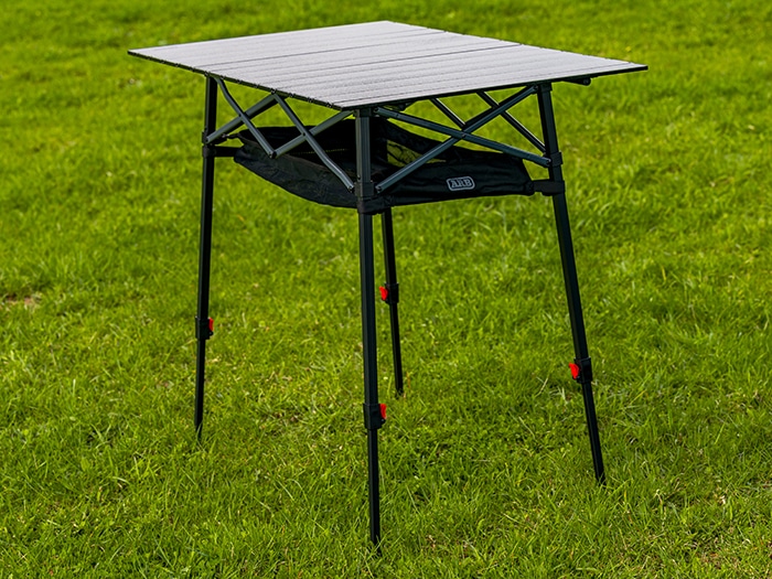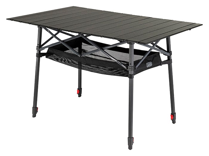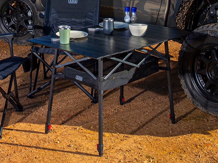 The ARB Pinnacle Camp Table is perfect for cooking and eating on the move. Its durable frame is made from black aluminum with contrasted charcoal crossbars. The generously sized black rugged tabletop provides ample space for your cooker, platters or meals. A key feature of this table is the adjustable legs. Each leg can be independently adjusted to allow for stability on uneven surfaces, and the table height can be adjusted anywhere from 790mm to 990mm. There are built in brackets on the frame which hold the included mesh basket for added storage. The table packs away into a compact 600D polyester carry bag featuring a built-in internal divider separating the tabletop from the frame.