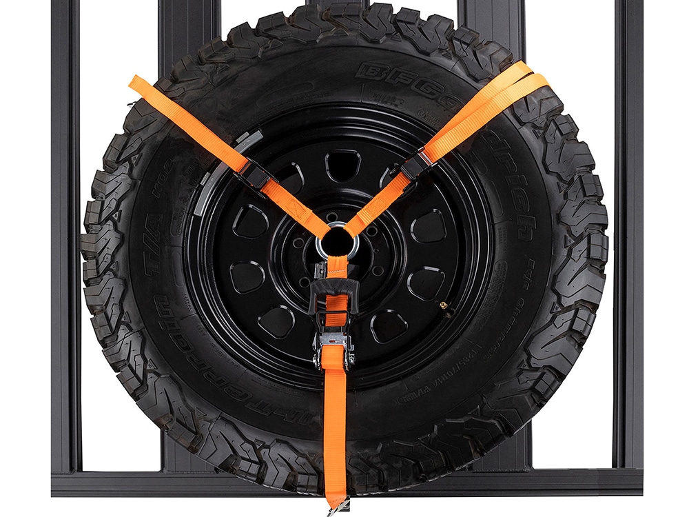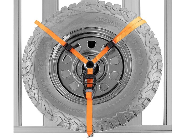 Wheel Y-Strap with snap lock style hooks to improve on some features of existing wheel straps in the market. Design features include a tether strap and snap lock hooks, which in combination positively retain the spare wheel and tyre even in the event of the spare wheel deflating. The tether strap also improves retaining of a tyre carcass only. Snap hooks work conveniently with ARB BASE Rack Eye Bolt Tie-Downs (not included part number – 1780200), or other aftermarket eyelets.