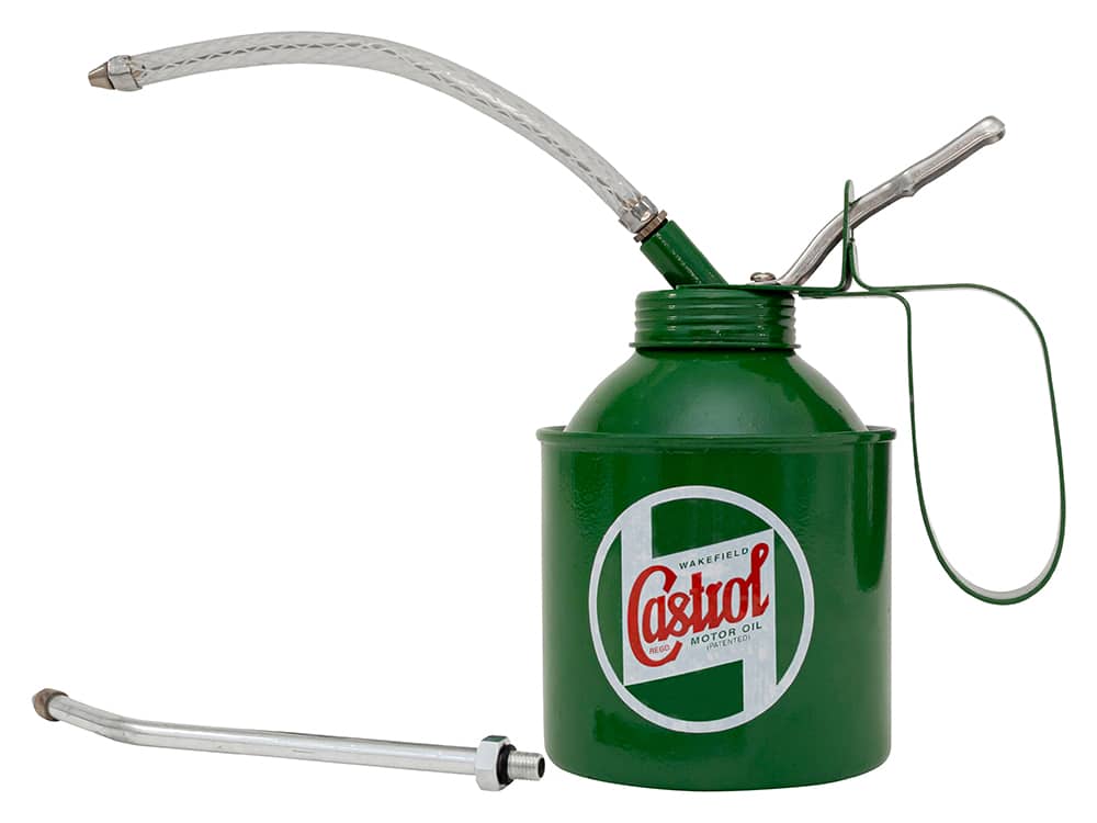 The classic Castrol oil applicator. Pump action screw top cans, supplied with exchangeable fixed and flexible applicators. With printed 1946 logo on one side. These period style oil cans are great for lubricating hard to reach places.
