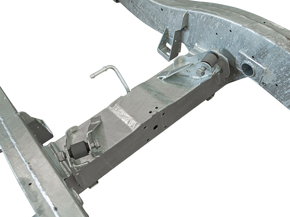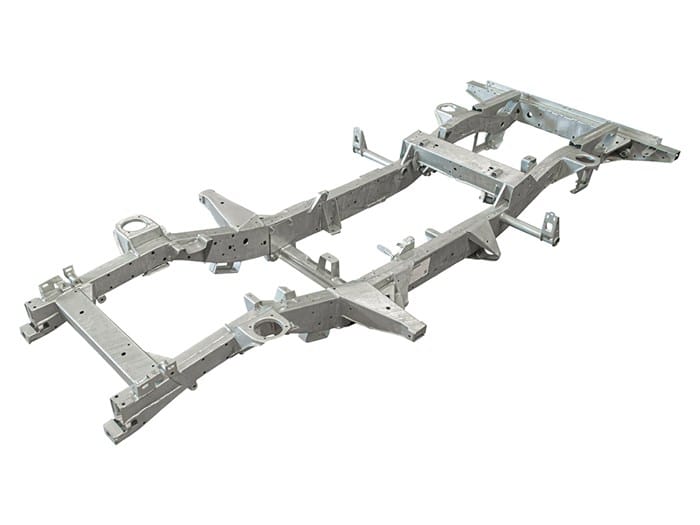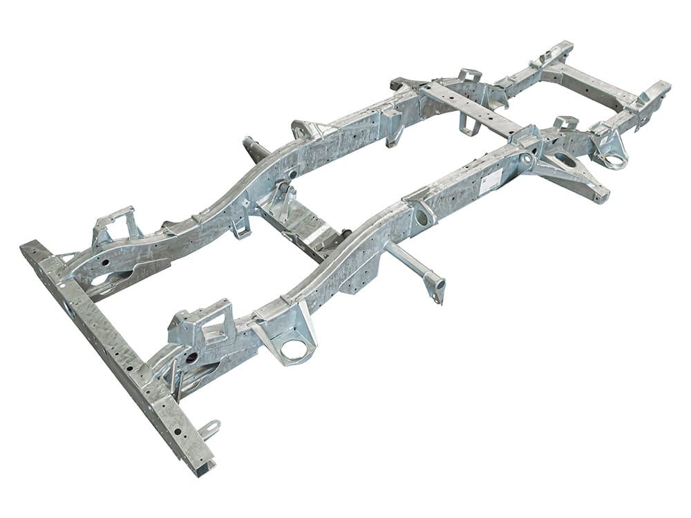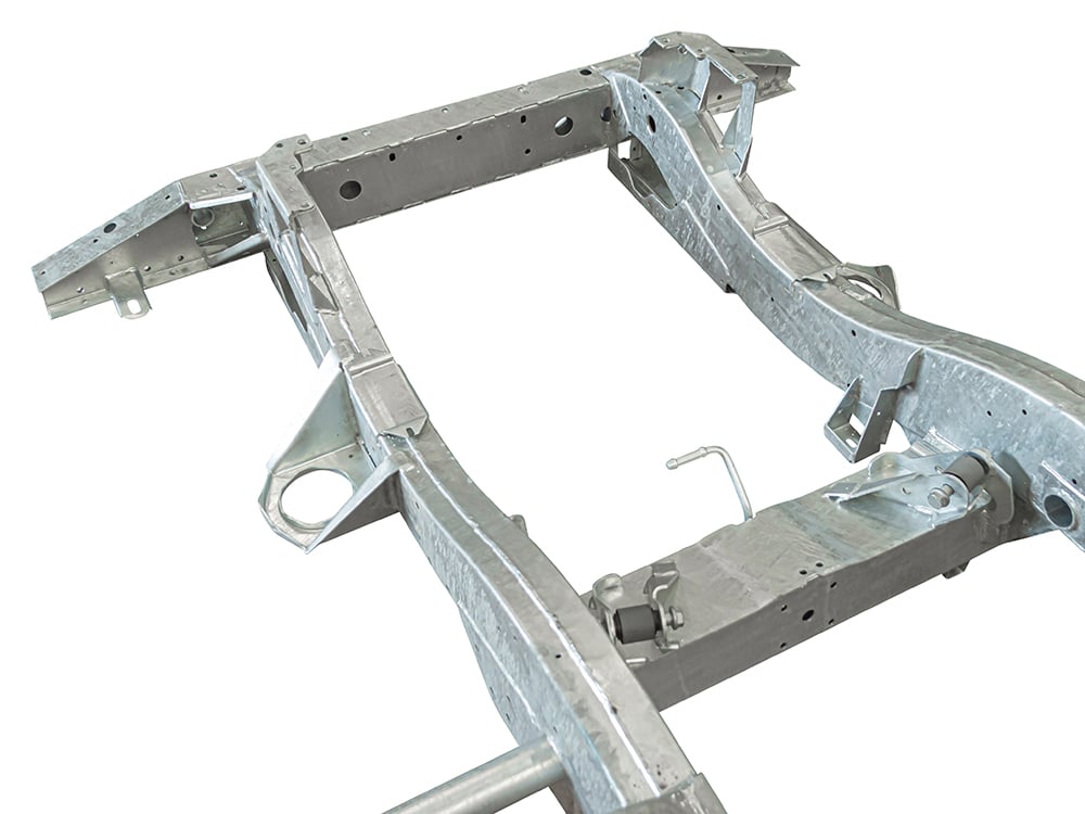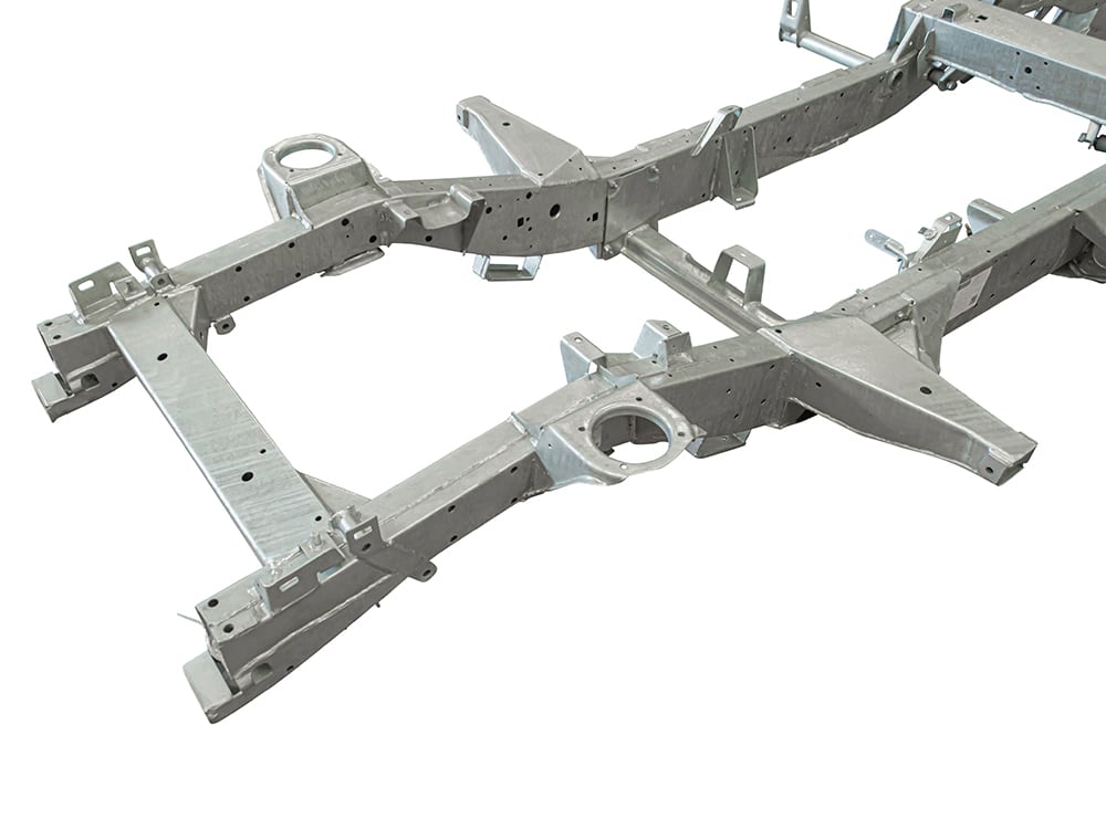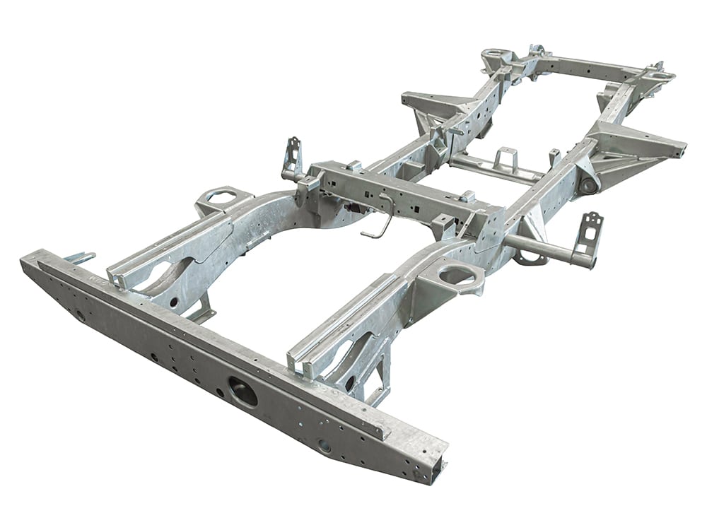All Defender chassis are built to 2016 type/latest specification, including rear cross member and A-frame cross member. GKN pressed section main legs/rails made from 2mm steel with 3mm stiffeners fitted and spot welded internally for added strength, effectively giving you 5mm of material where most needed. Chassis supplied with bolt in gearbox cross member, rear cross member to body bracket, A-frame to chassis bushes including fixings. Power steering pipe, fuel filter, fuel tank and fuel line riv nuts fitted to chassis. All holes drilled and tapped excluding rear tow pack holes. Galvanised as standard.