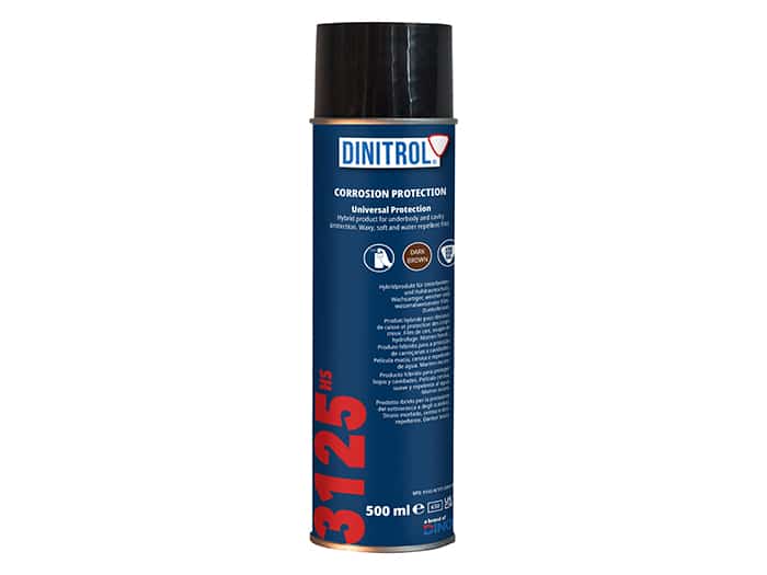 Dark brown vehicle underbody chassis coating. Dinitrol 3125 HS is designed for application mainly as a cavity protection and a thin underbody coating. Main objects to be treated are used vehicles with some corrosion present. For improved performance on more corroded surfaces, Dinitrol ML or Dinitrol ML HS can be used as a pre-treatment. The slightly thixotropic nature of the product ensures an evenly applied film to the required thickness and strength. The non dripping solvent based black underbody coating rust preventative is specially formulated, with a high dry matter content. This minimises environmental pollution and occupational exposure during on-line application. The product can be applied with an underbody coating gun.