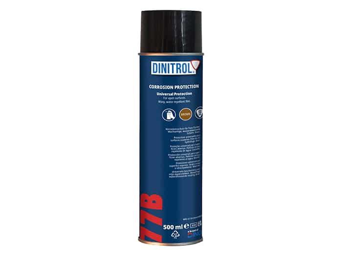 DINITROL 77B is a corrosion preventive fluid, designed for long-term protection against corrosion and, due to its residual hard film affords some protection against mechanical wear. DINITROL 77B contains environmentally acceptable low aromatic solvents, which once evaporated leaves a thick, brown waxy film. DINITROL 77B is primarily designed for cavity protection but may also be used for storage, trans-port and underbody protection.