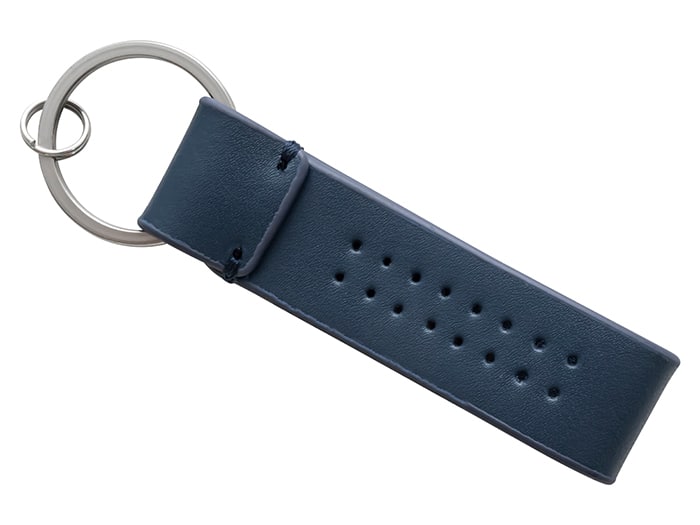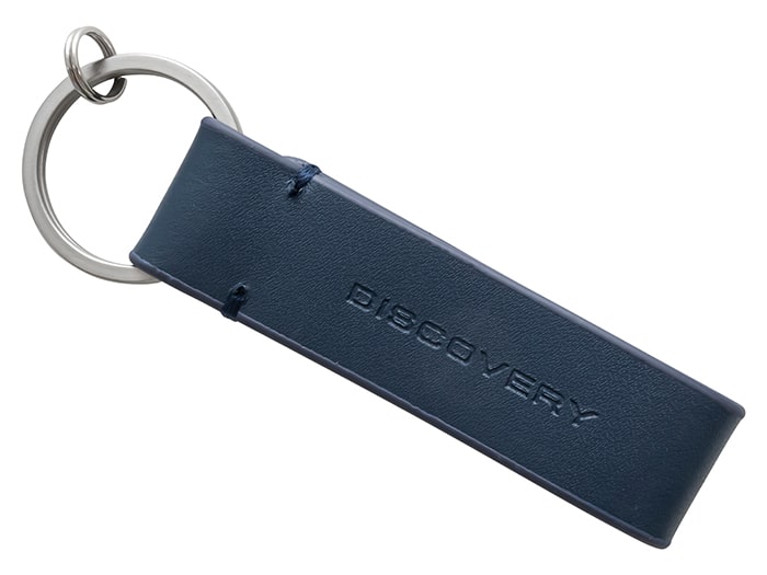 Blue leather loop keyring featuring debossed Discovery workmark