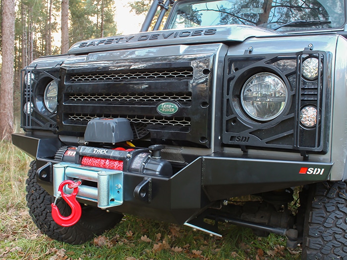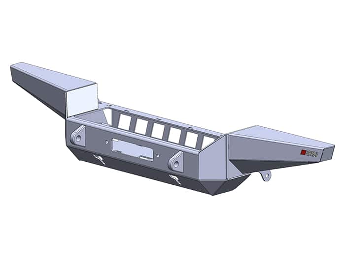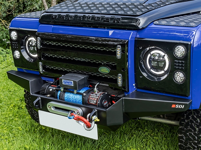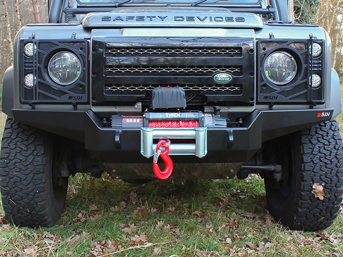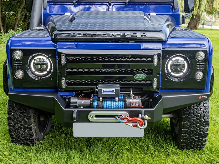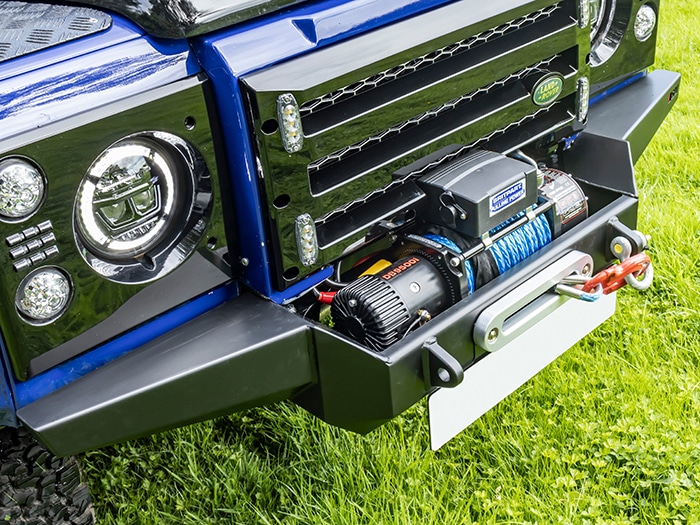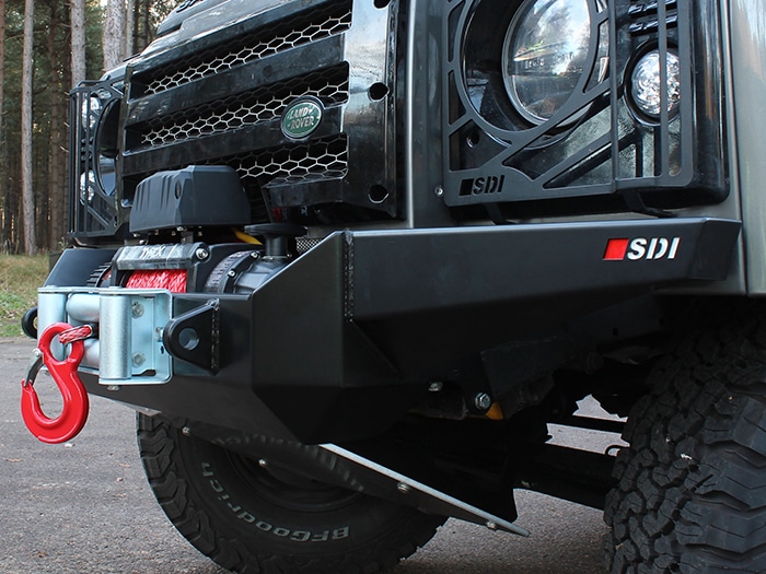 Constructed from 3 & 5mm steel plate and finished in a durable zinc-based powder coat, this bumper provides the option to install a variety of different winches using the mounting dimensions are 254 x 114.5mm. There are also 2 x recovery shackle mounts (23mm hole) along with an opening for a standard 255mm hole centre fairlead to be installed. Can be installed to both air-con and non-air-con Defenders, although the grille may need to be modified on an air-con model, depending on the winch installed. The OEM chassis jacking points must be removed from the end of the chassis legs to allow the bumper to fit.