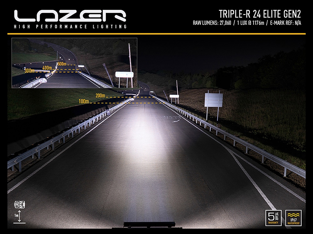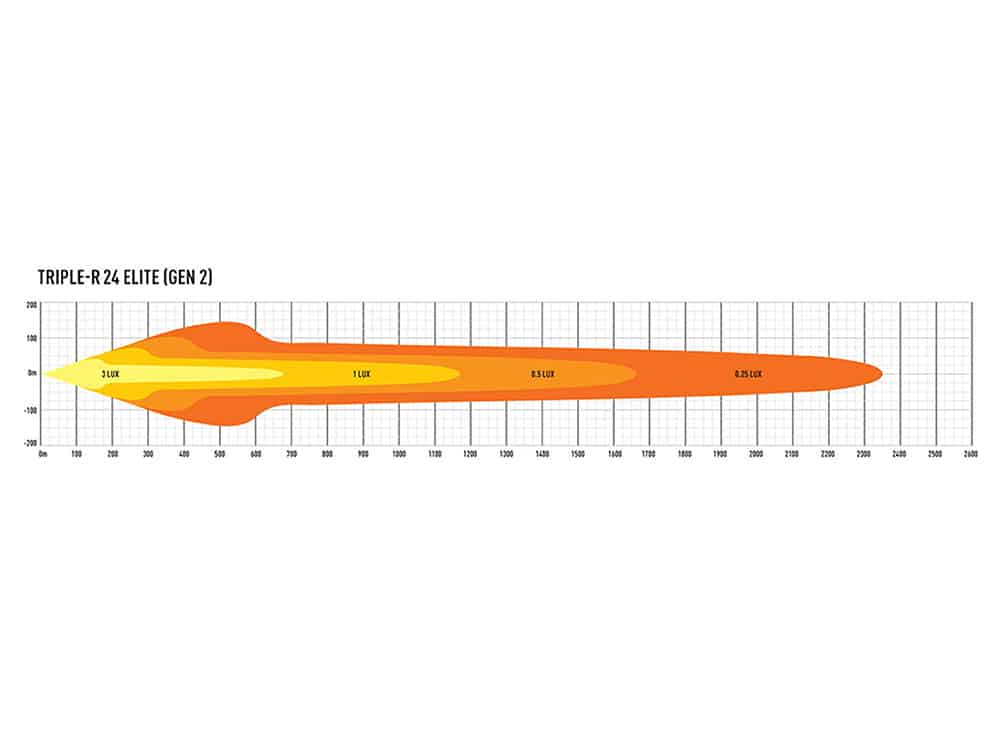 Boasting 27,060 lumen, delivering 1 lux to 1176m, the next generation of Triple-R 24 Elite delivers incredible distance illumination. Still it is through the improved left/right spread of light that this market leading driving light really impresses. A combination of LEDs on the outer reflectors delivers the superior visibility at the sides of the road, which is really evident to see and appreciate. At the same time the up/down spread of light has been flattened, which considering the typical mounting position of the light, is preferable to ensure a clean distribution of light in front of your vehicle, and also reducing glare which can otherwise come from some roof mount installs.