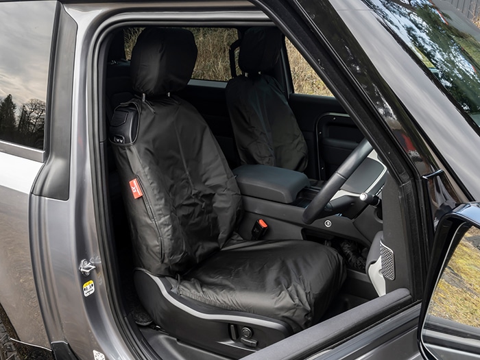 Custom-made seat covers designed and manufactured in the UK. These seat protectors are guaranteed waterproof and are perfect for guarding your Land Rover’s seats from not only daily wear, but also from spills, oil, grease, pet fur, and everyday dirt and grime. Attention to detail ensures that these covers fit seamlessly. They feature elasticated borders around the seat base and come with complete backs. The back also features a slit to enable the rear passengers to use the seat pocket in front of them. To ensure they remain securely in position, they’re equipped with elastic straps and buckle fastenings beneath. Additionally, individual headrest covers are included, allowing for height adjustments. The covers have expertly sewn seams that are then top-stitched, ensuring durability and a quality finish. Convenient velcro openings at the seat top mean you can install them without the need to remove the headrests. Constructed from resilient 600 Denier Polyester with a polyurethane coating, the fabric is 100% waterproof. This robust and premium material has a slightly textured surface for added comfort.